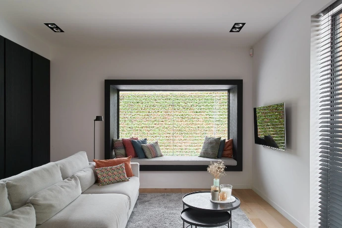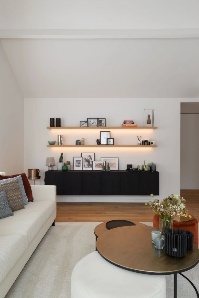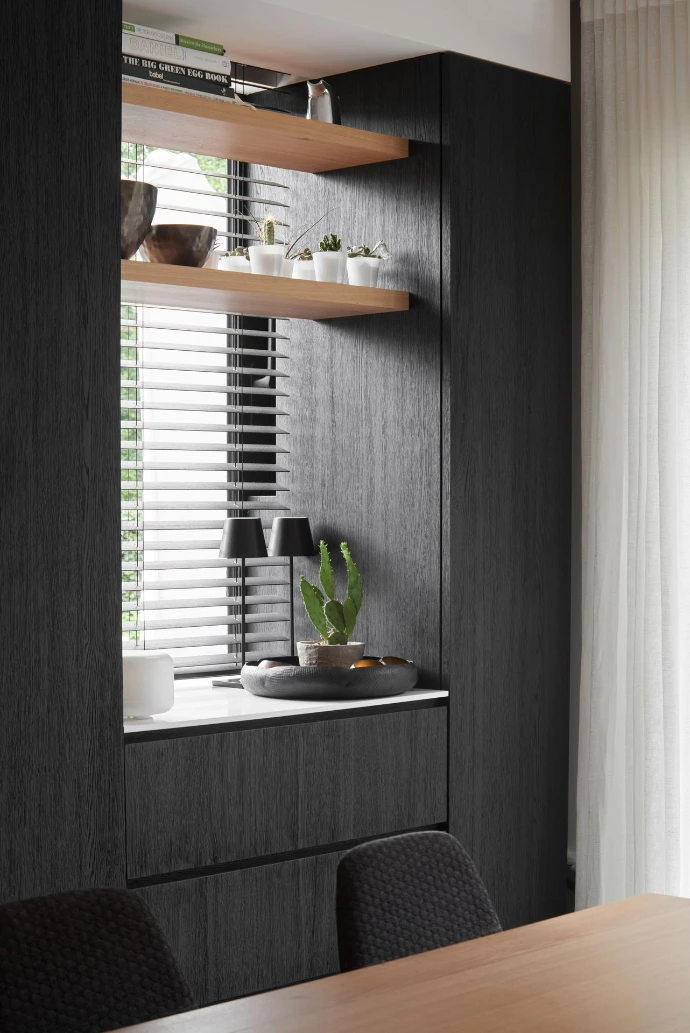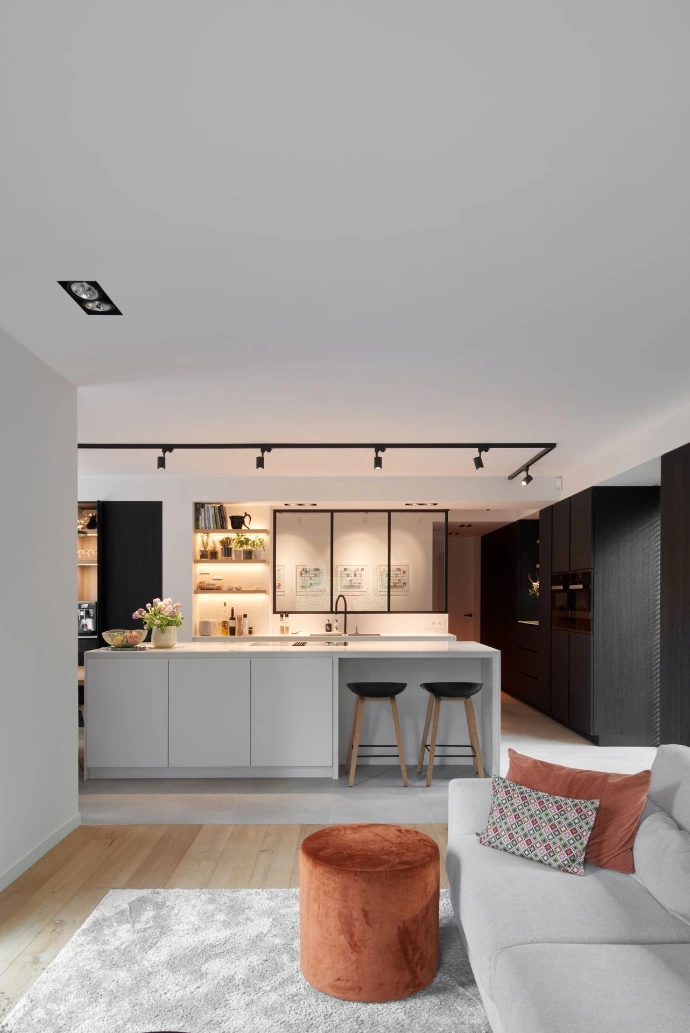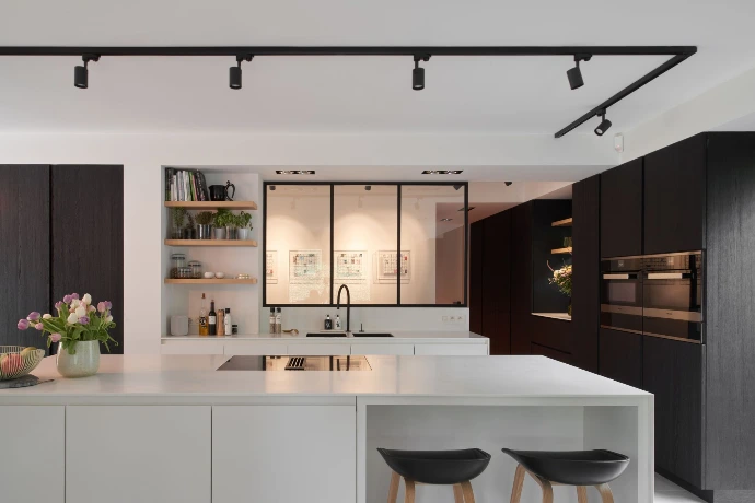 Een tijdloos kleurenpalet en een doordachte mix van materialen zorgen voor een frisse, evenwichtige look. Het witte keukeneiland contrasteert mooi met de donkere houten kasten, terwijl stalen frames een strak en elegant accent toevoegen.